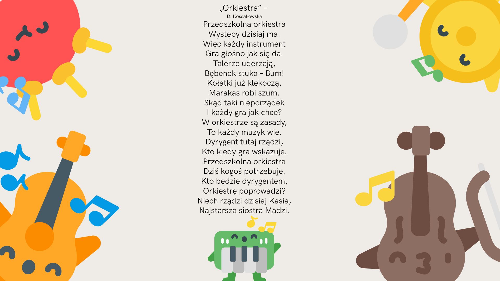 Cele: Zaznajomienie z wybitnym dziełem malarstwa. Rozwijanie wrażliwości na różne zjawiska wizualne: światło, barwa, kształt, proporcje, kompozycja. Okrywania różnych możliwości zastosowania chusty animacyjnej. Rozwijanie sprawności grafomotorycznej. Doświadczanie powstawania dźwięków. Rozwijanie wrażliwości muzycznej. Odkrywanie rozmaitych kombinacji barwnych plam, linii. Zaznajomienie z wyglądem litery „G, g”Rozwijanie inwencji twórczej. Rozwijanie słuchu i wyobraźni muzycznej poprzez eksperymentowanie z muzyką. Doskonalenie umiejętności posługiwania się znakami matematycznymi „<,>, =” . Poszerzenie wiedzy na temat wyglądu i brzmienia instrumentów muzycznych. Wzbogacenie wiedzy na temat warsztatu pracy artysty – fotografa.
