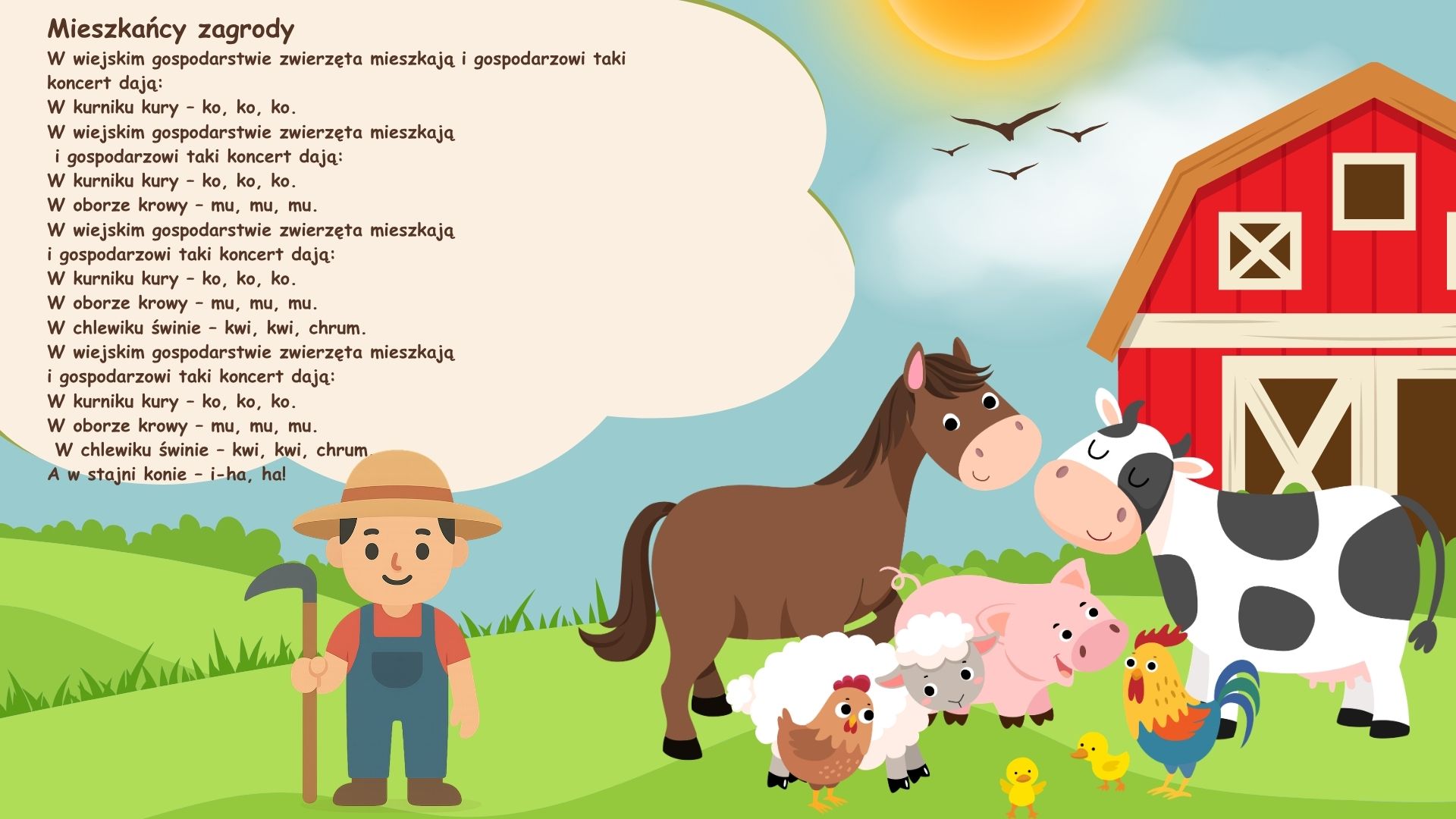 Cele ogólne: Umożliwienie dzieciom zdobywania wiedzy na temat wsi i zwierząt hodowlanych (uświadomienie potrzeby hodowania zwierząt, wskazanie, jakie korzyści przynosi to człowiekowi). Poznanie różnic w krajobrazie wiejskim i miejskim. Poznawanie narzędzi ogrodniczych potrzebnych na wsi i ich zastosowania. Rozwijanie spostrzegawczości słuchowej. Rozwijanie opiekuńczego stosunku do zwierząt. Utrwalenie pojęć: wewnątrz, na zewnątrz. rozwijanie zainteresowań czytelniczych. Rozwijanie pamięci dowolnej, percepcji wzrokowej oraz kreatywności.