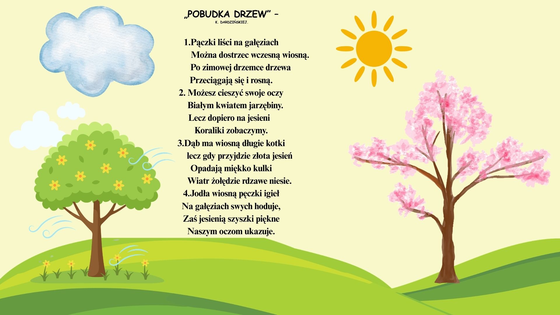 Cele ogólne: Gromadzenie wiedzy o drzewach. Zaznajomienie z wyglądem litery „H, h”. Uświadomienie sobie znaczenia drzew, potrzeby ich ochrony. Zauważanie różnic między igłami i liśćmi. Wzbogacenie słownika biernego: korzenie, pień, gałęzie, konary, liście. Rozwijanie koordynacji ruchowej. Rozwijanie spostrzegawczości słuchowej. Rozwijanie postawy życzliwości w kontaktach z młodszymi kolegami. Rozwijanie zainteresowań czytelniczych.